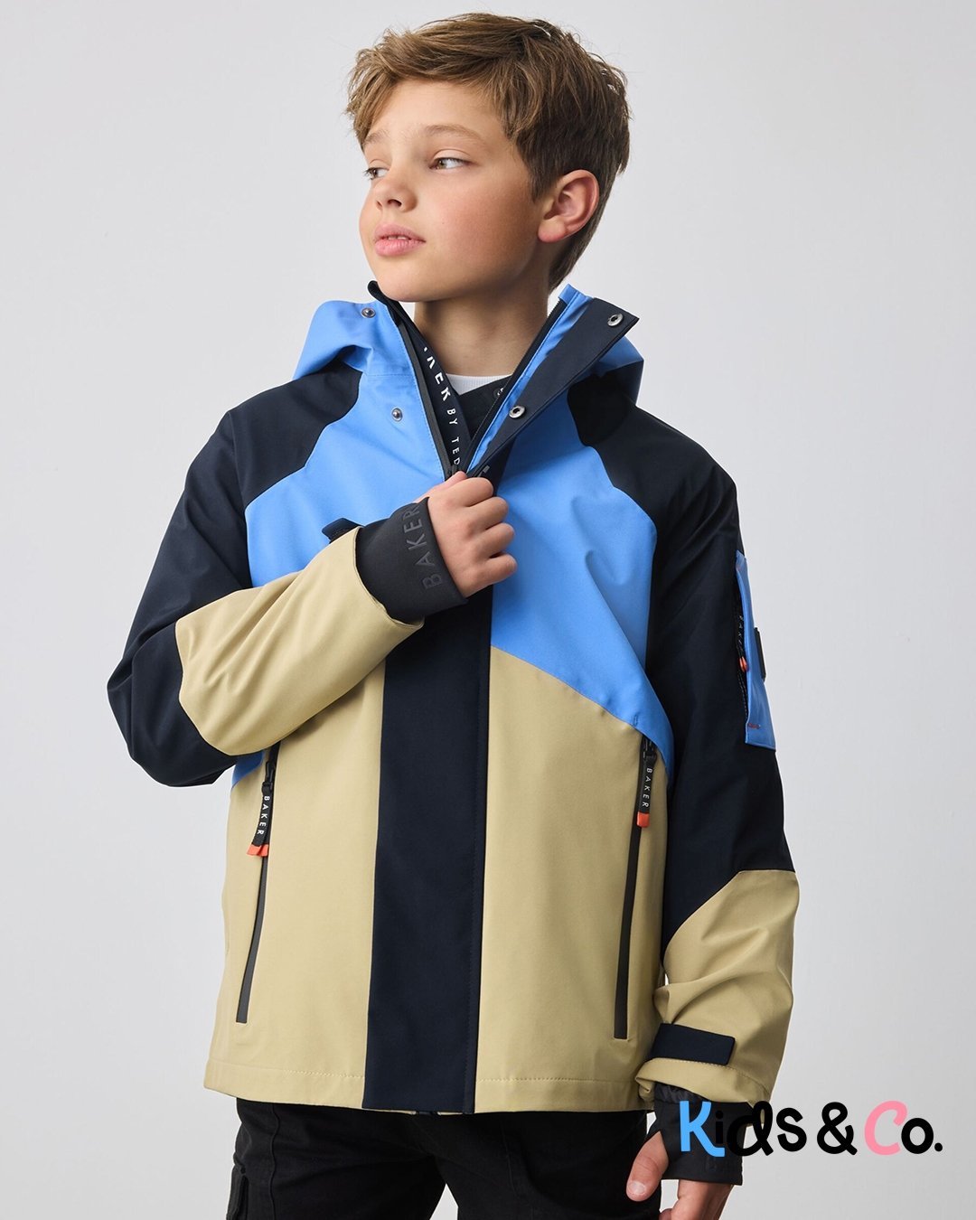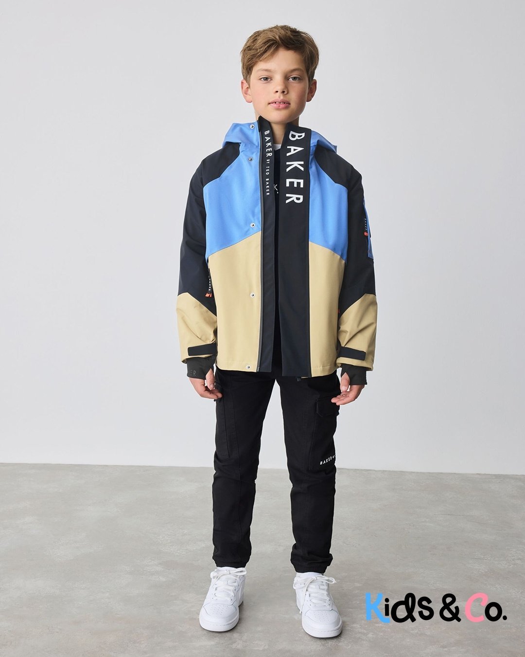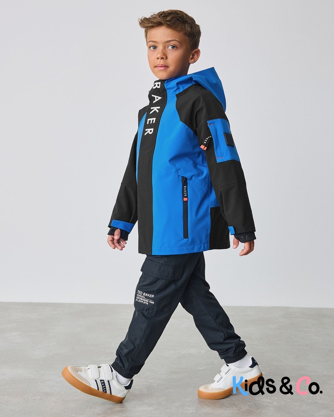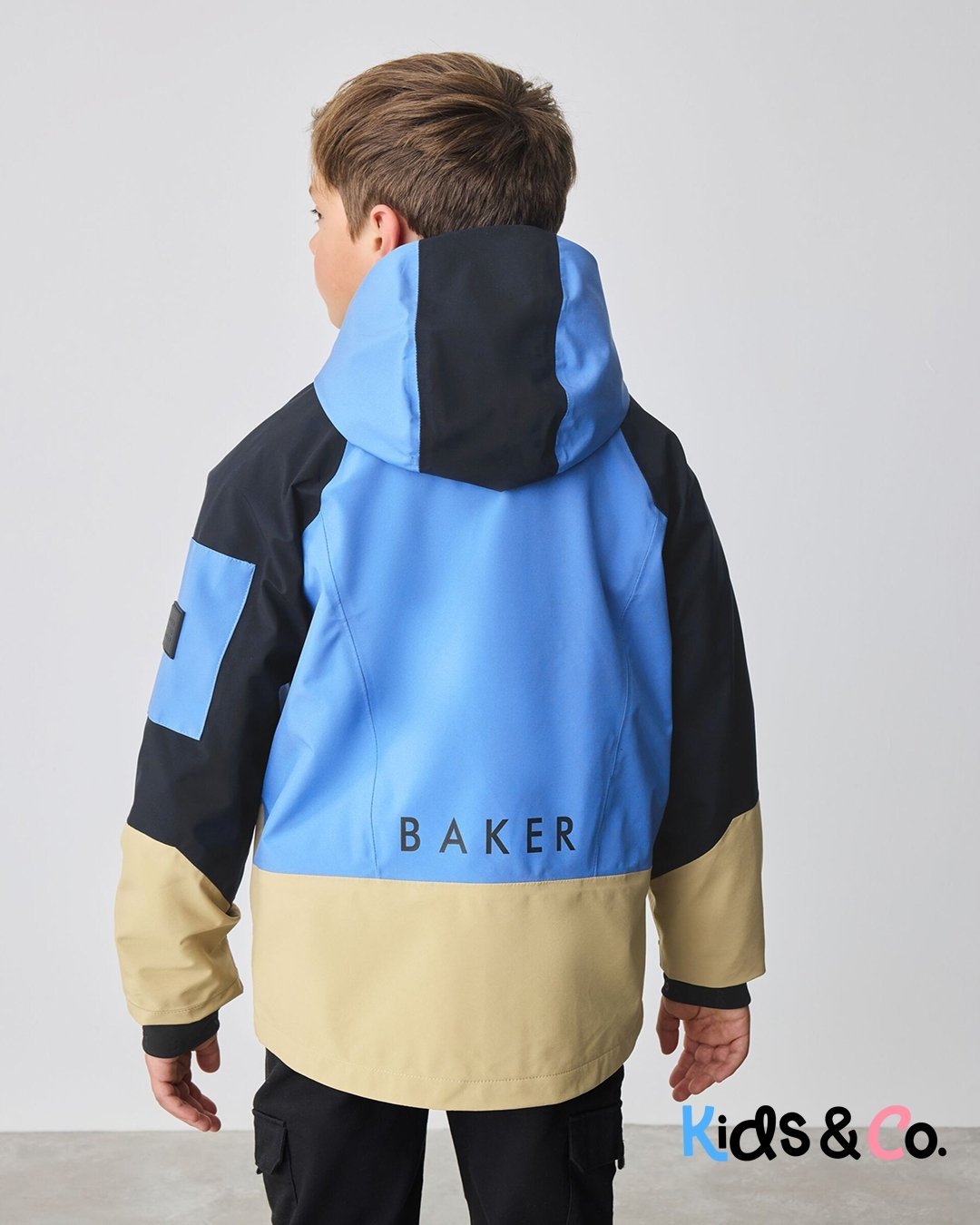 He can brave unpredictable weather in signature style with the Baker by Ted Baker Shower Resistant Colourblock Coat. This striking colourblock parka is designed to be both shower resistant and durable, making it an essential layer for any adventure.It features practical branded storm cuffs to keep out the elements and a secure inner pocket with zip for valuables.Adding to its distinct look, a bold BAKER print runs down the front of the coat, complemented by a branded inner zipper placket. An arm pocket with a branded zip puller and a coordinating branded badge on the arm pocket offer extra utility and style. The coat is finished with side pockets featuring branded zip pullers, adjustable branded self-fastening cuff tabs for a custom fit, and prominent Baker branding on the back of the parka, ensuring a statement-making piece that blends functionality with Ted Baker’s unique aesthetic.