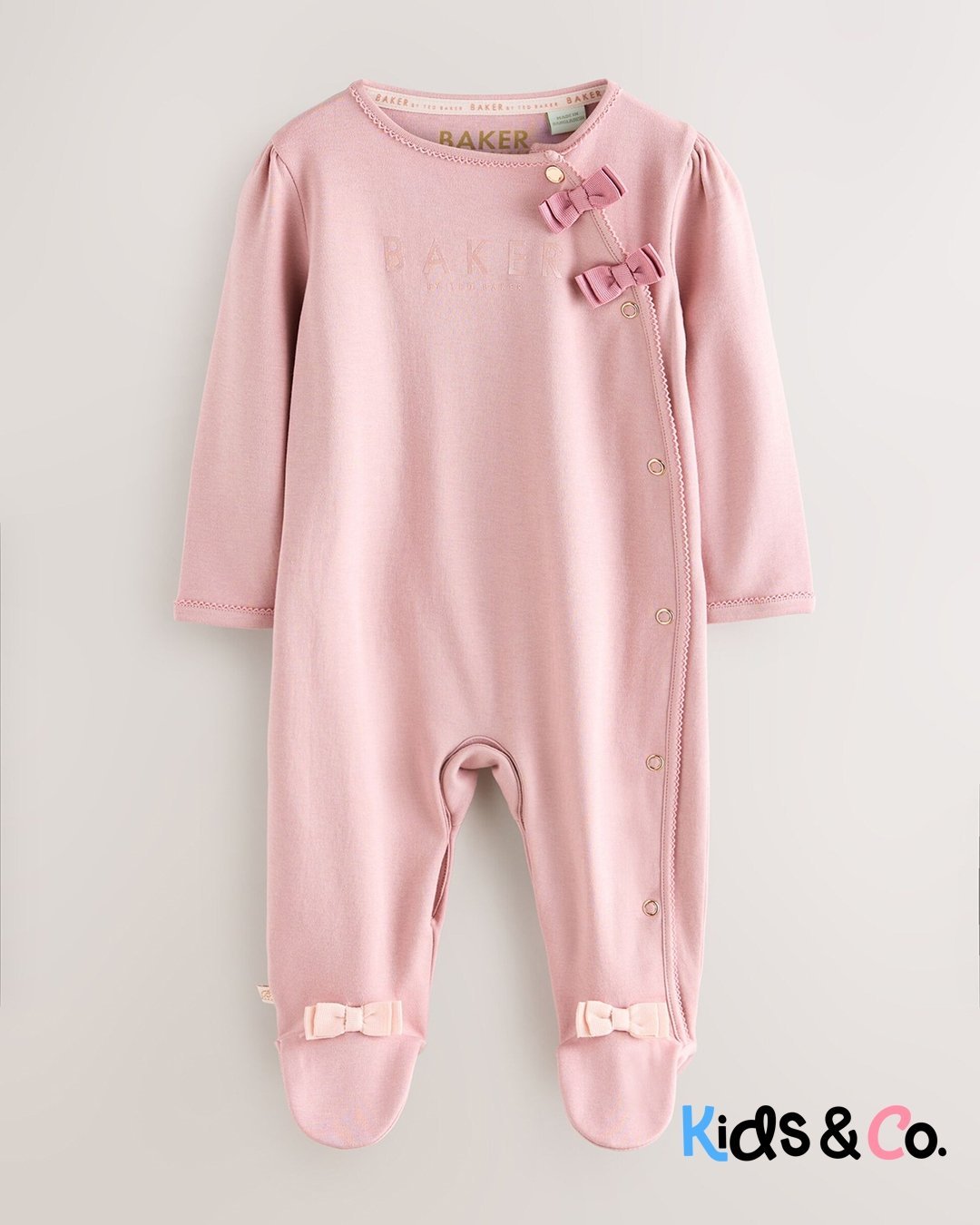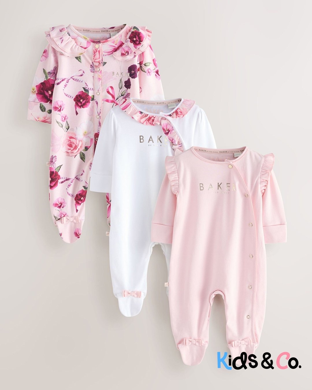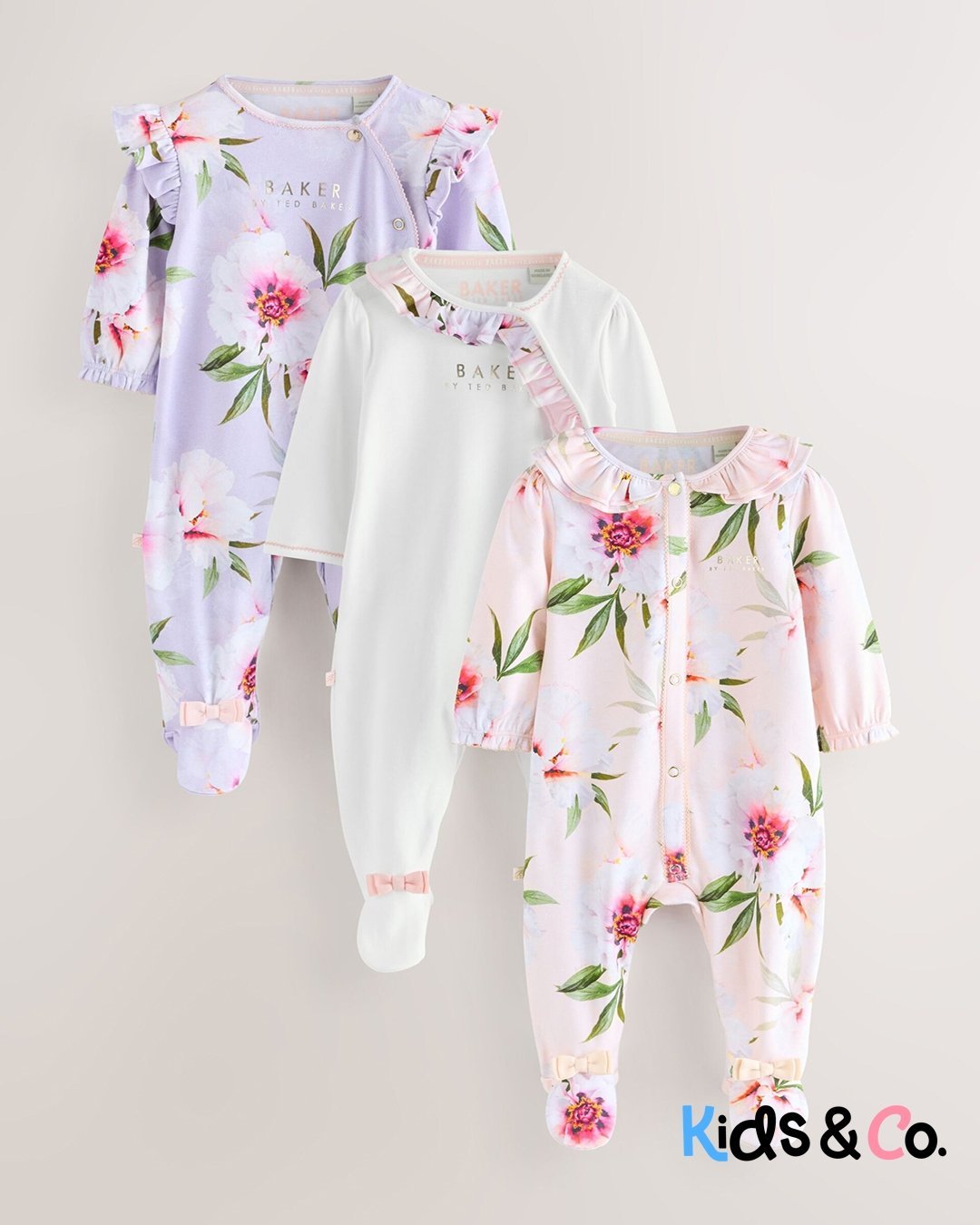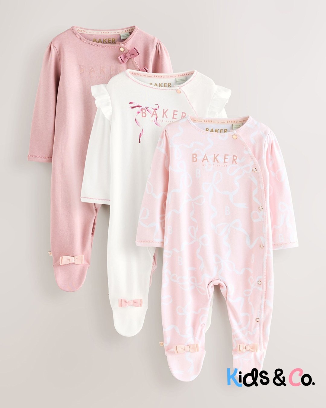 These adorable sleepsuits from Baker by Ted Baker will keep your little one looking and feeling great. The pack contains three sleepsuits all crafted in soft cotton with the iconic branding printed across the chest and pink bow details on the feet. They are also designed with popper fastenings between the legs to help at changing times.