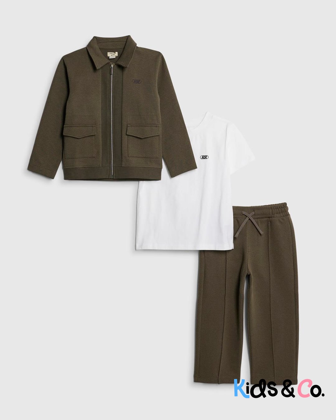 3 piece set Harrington Jacket Collar Zip fastening Front pocket detail Crew Neck T-shirt Elasticated Waist Trousers Seam Detail