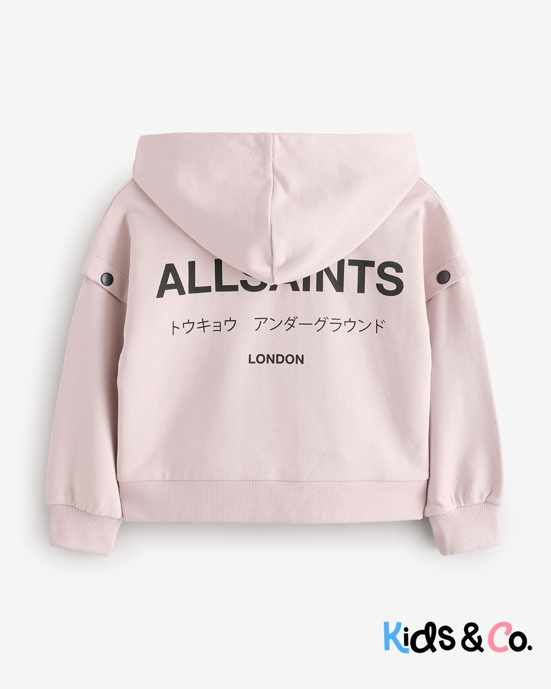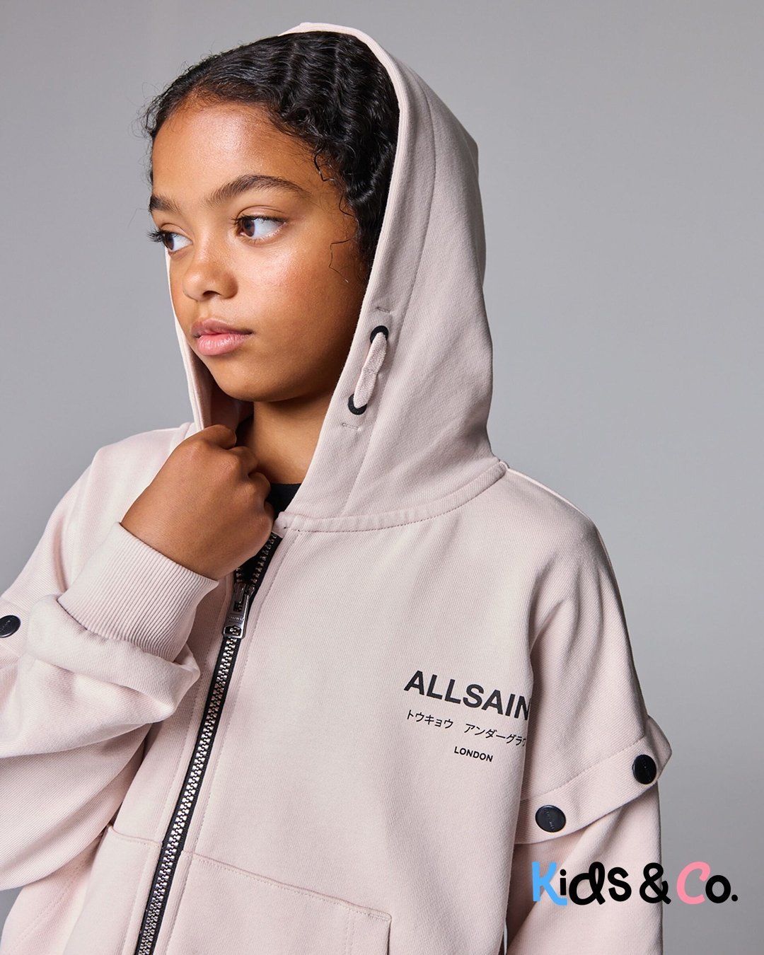 Layer her up in style with the Signature Underground Hoodie from smALLSAINTS. Crafted from soft cotton in light pink and designed for an oversized fit, this stylish hoodie also features a mock popper shoulder detail with a kangaroo pocket on the front. It is finished with the iconic AllSaints signature logo across the chest and a zip closure. Signature Underground Zip Hoodie AllSaints signature logo across the chest Mock popper shoulder Zip closure Hood Long sleeve Kangaroo pocket Oversized fit • Crafted from 100% cotton Machine washable. Main 100% Cotton. Hood 100% Cotton. Rib 95% Cotton, 5% Elastane.