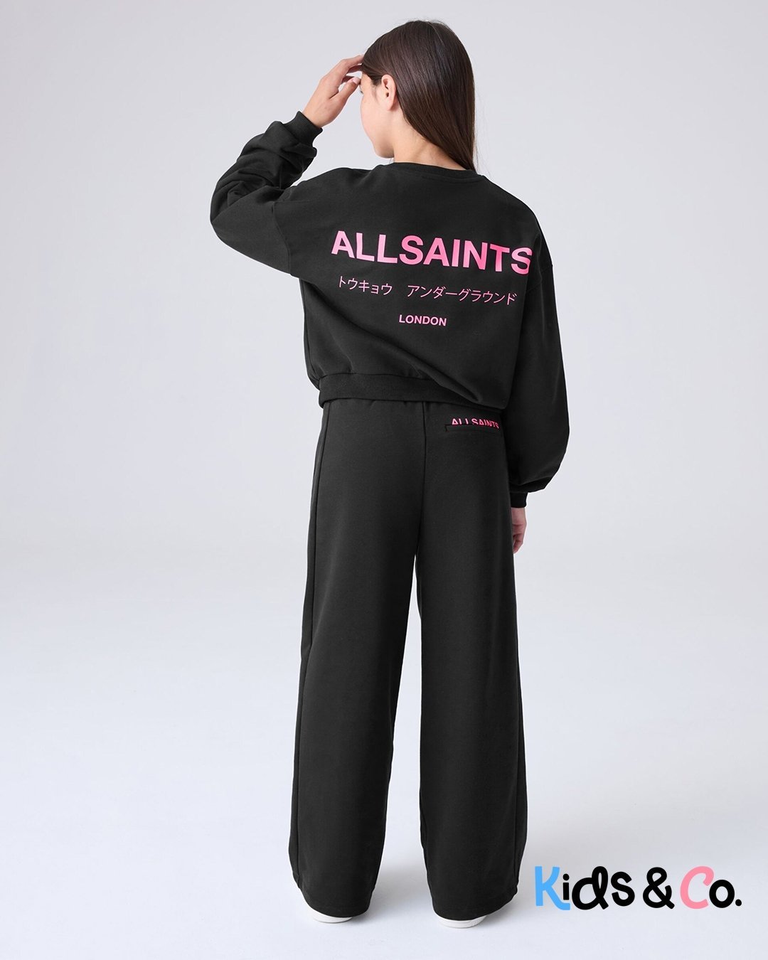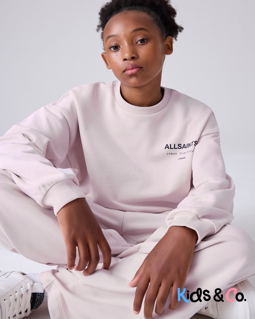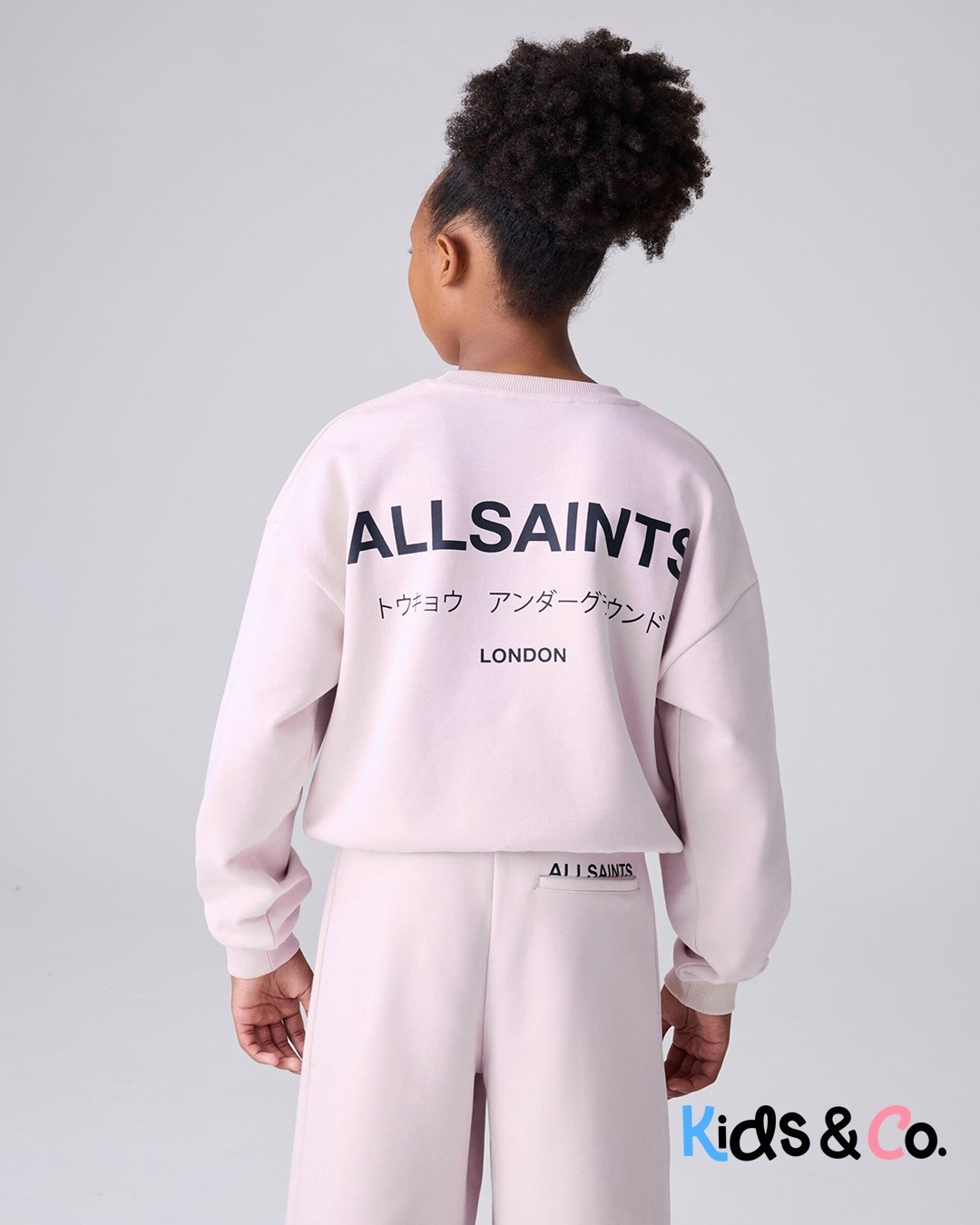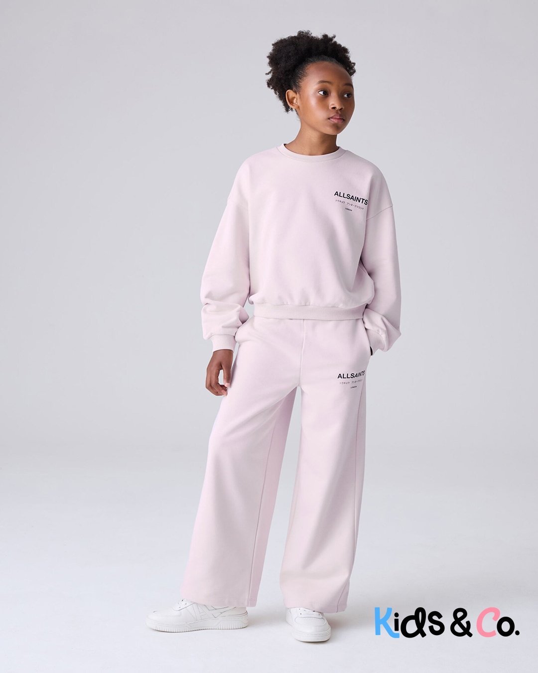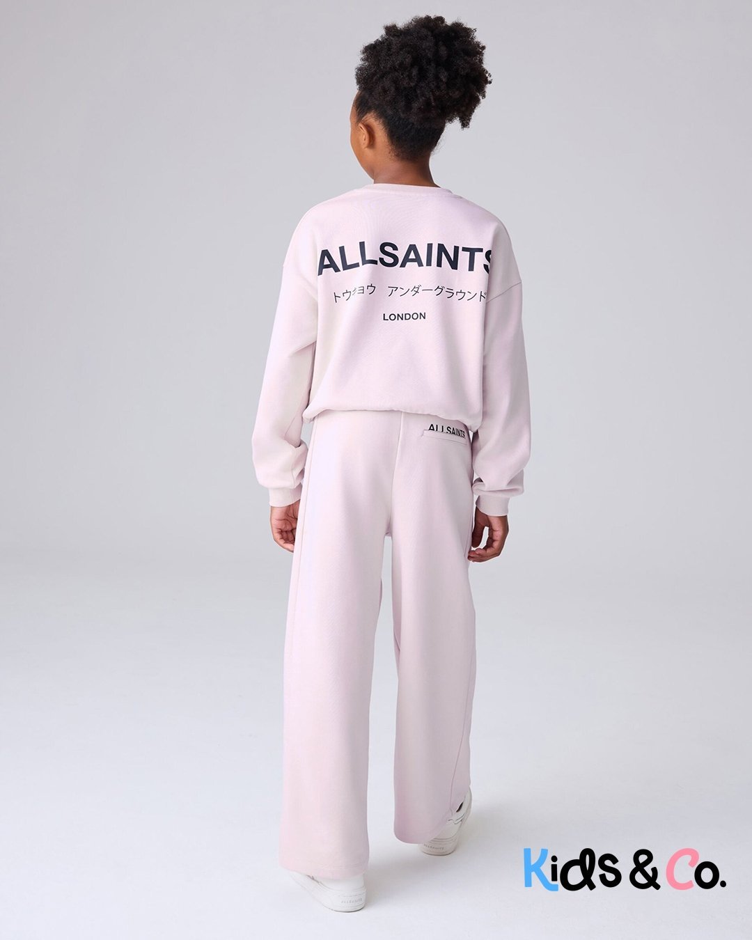 Lounge in style with the smALLSAINTS Light Pink Underground Sweatshirt and Wide Leg Joggers Set. This coordinated set is crafted from soft, 100% cotton for ultimate comfort. The oversized sweatshirt features the signature AllSaints logo on the chest and a larger print on the back, while the wide-leg joggers have a comfortable elasticated waist and convenient side pockets. A rear pocket with a peeping AllSaints logo adds a subtle designer touch, making this the perfect choice for a relaxed yet stylish look. 2 piece set AllSaints logo details Oversized sweatshirt Wide leg joggers Machine washable. Sweater Main 100% Cotton. Rib 98% Cotton, 2% Elastane. Jogger 100% Cotton.
