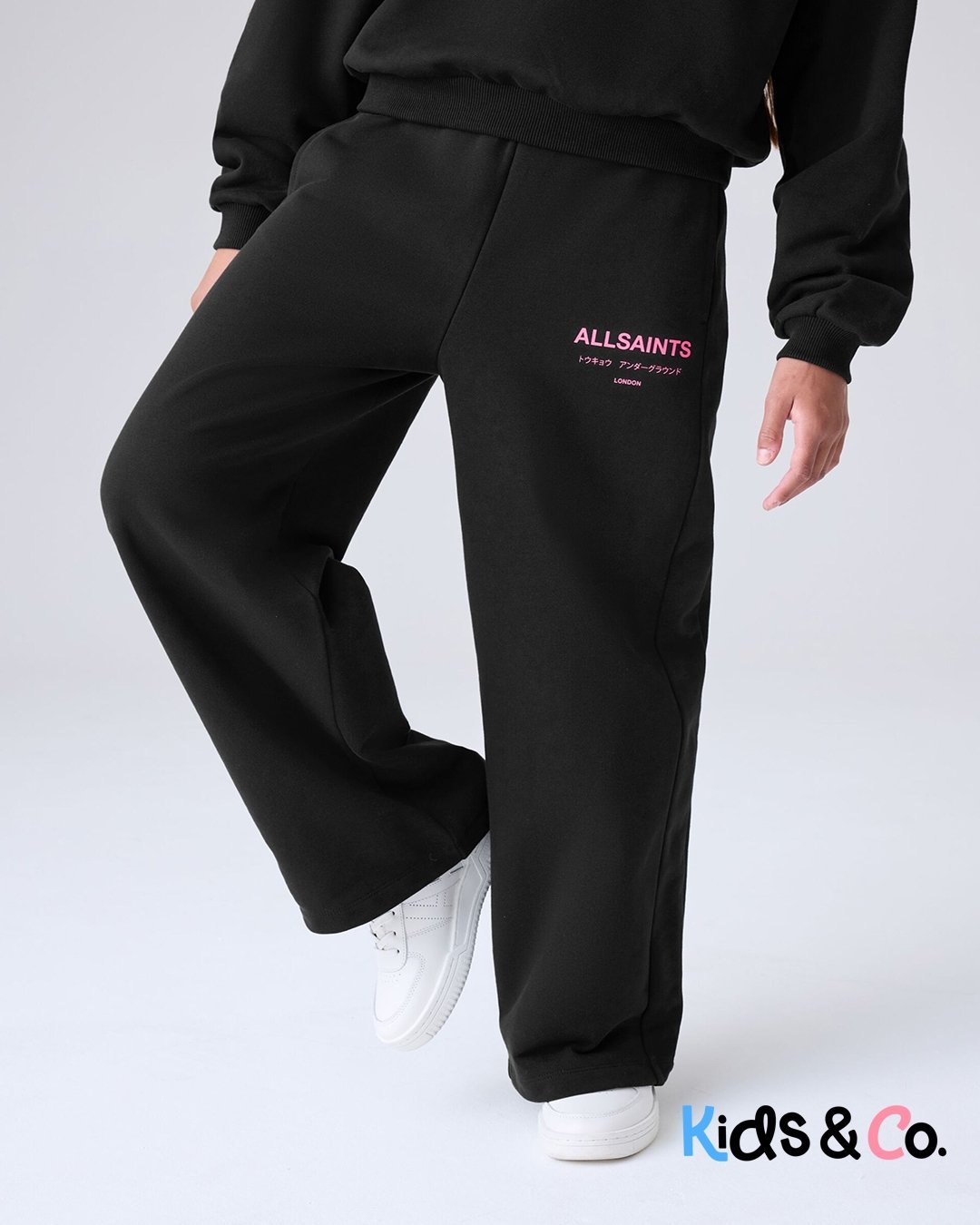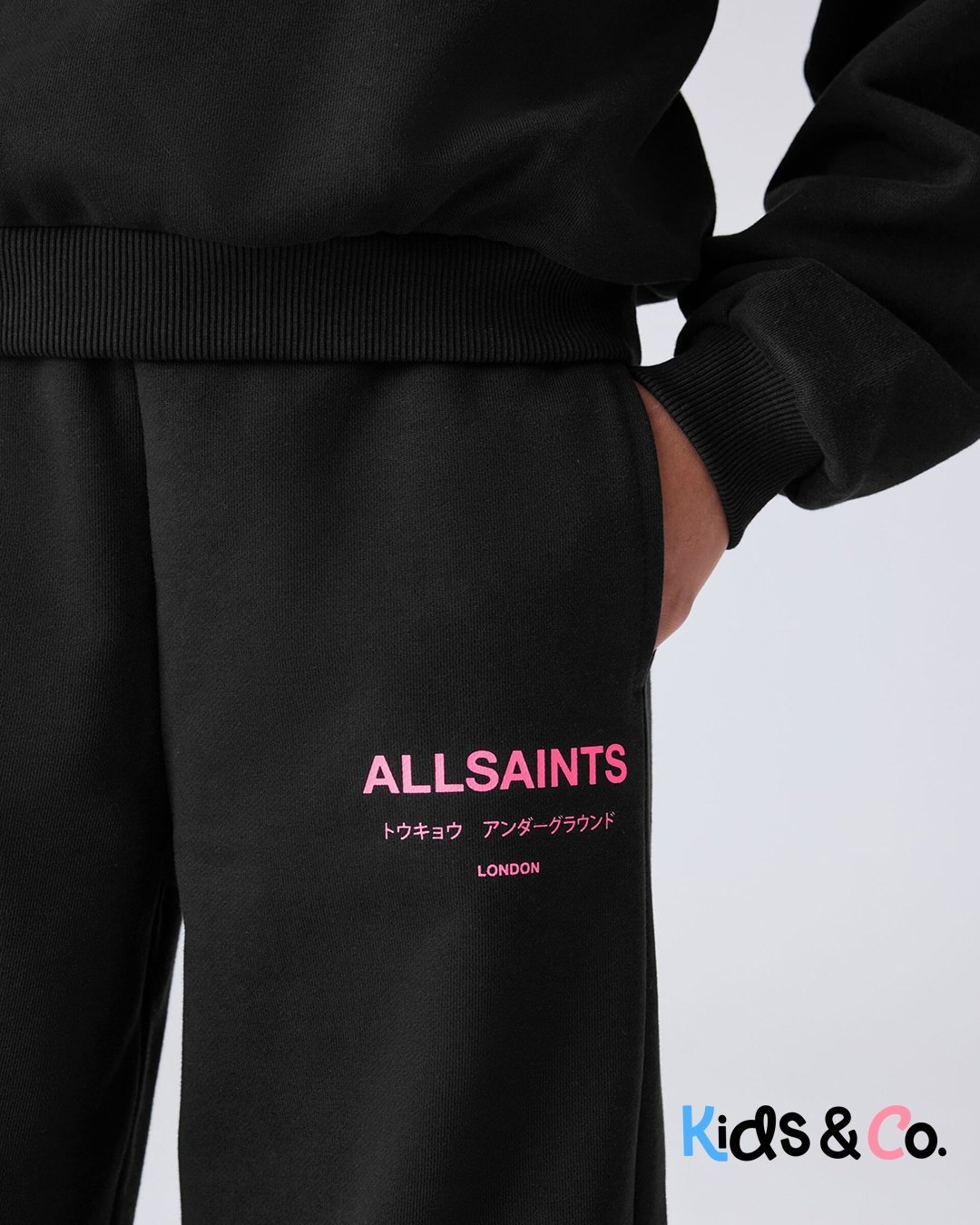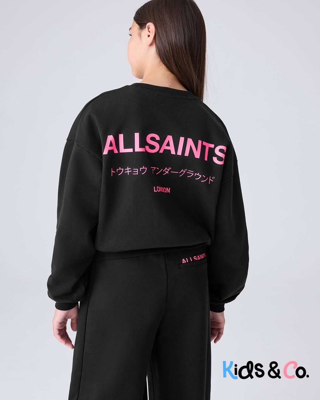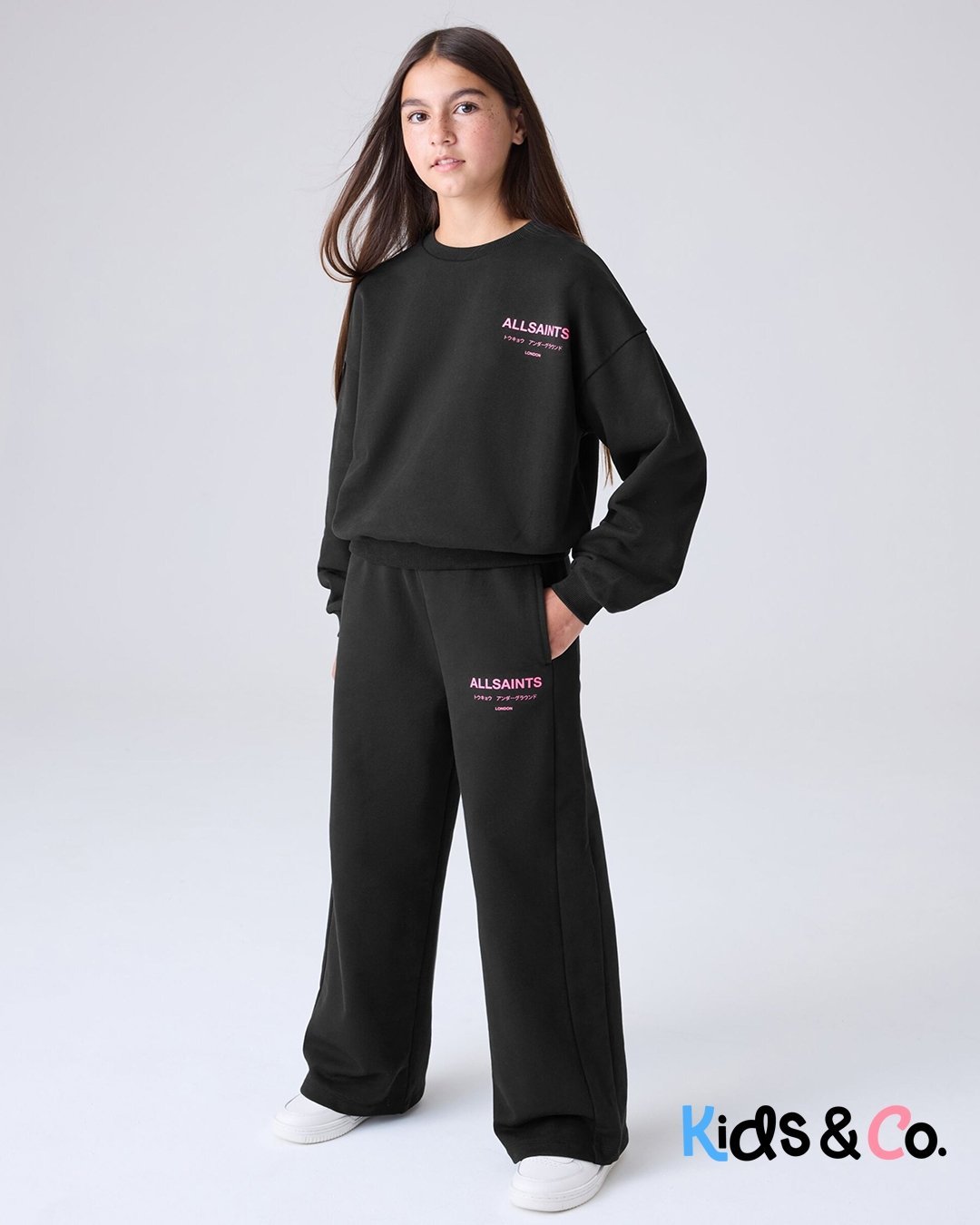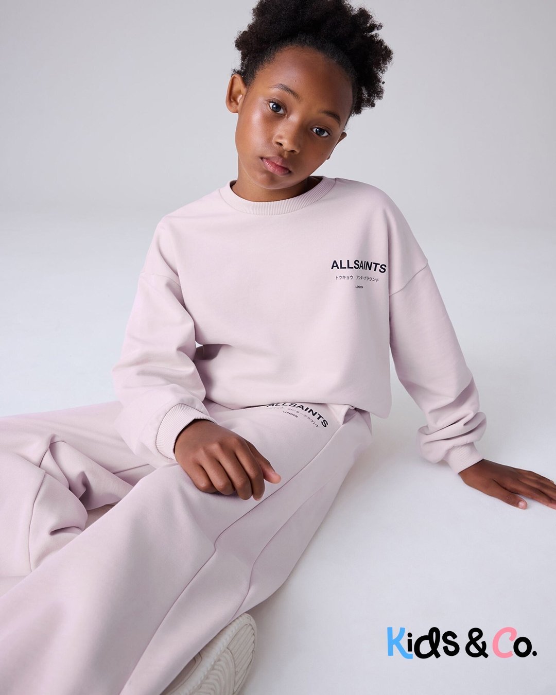 Lounge in style with the smALLSAINTS Light Pink Underground Sweatshirt and Wide Leg Joggers Set. This coordinated set is crafted from soft, 100% cotton for ultimate comfort. The oversized sweatshirt features the signature AllSaints logo on the chest and a larger print on the back, while the wide-leg joggers have a comfortable elasticated waist and convenient side pockets. A rear pocket with a peeping AllSaints logo adds a subtle designer touch, making this the perfect choice for a relaxed yet stylish look. 2 piece set AllSaints logo details Oversized sweatshirt Wide leg joggers Machine washable. Sweater Main 100% Cotton. Rib 98% Cotton, 2% Elastane. Jogger 100% Cotton.