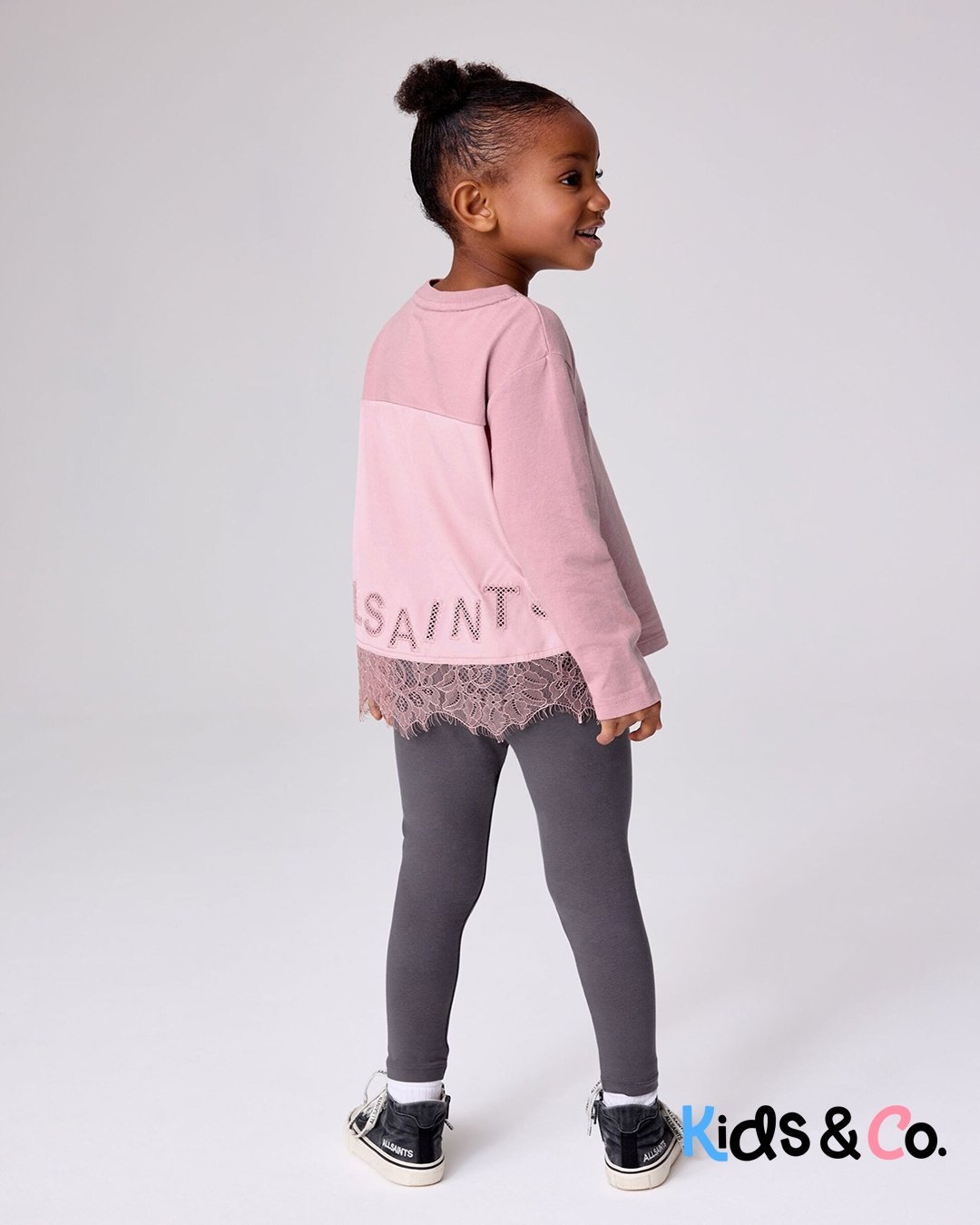 T-shirt and legging set, T-shirt with satin and lace panel at the back, AllSaints logo at the front and back t-shirt, Relaxed fit t-shirt with dip back hem, Available in older sizes Machine washable. T-shirt Main 100% Cotton. Back Panel 100% Polyester. Leggings 92% Cotton, 8% Elastane.