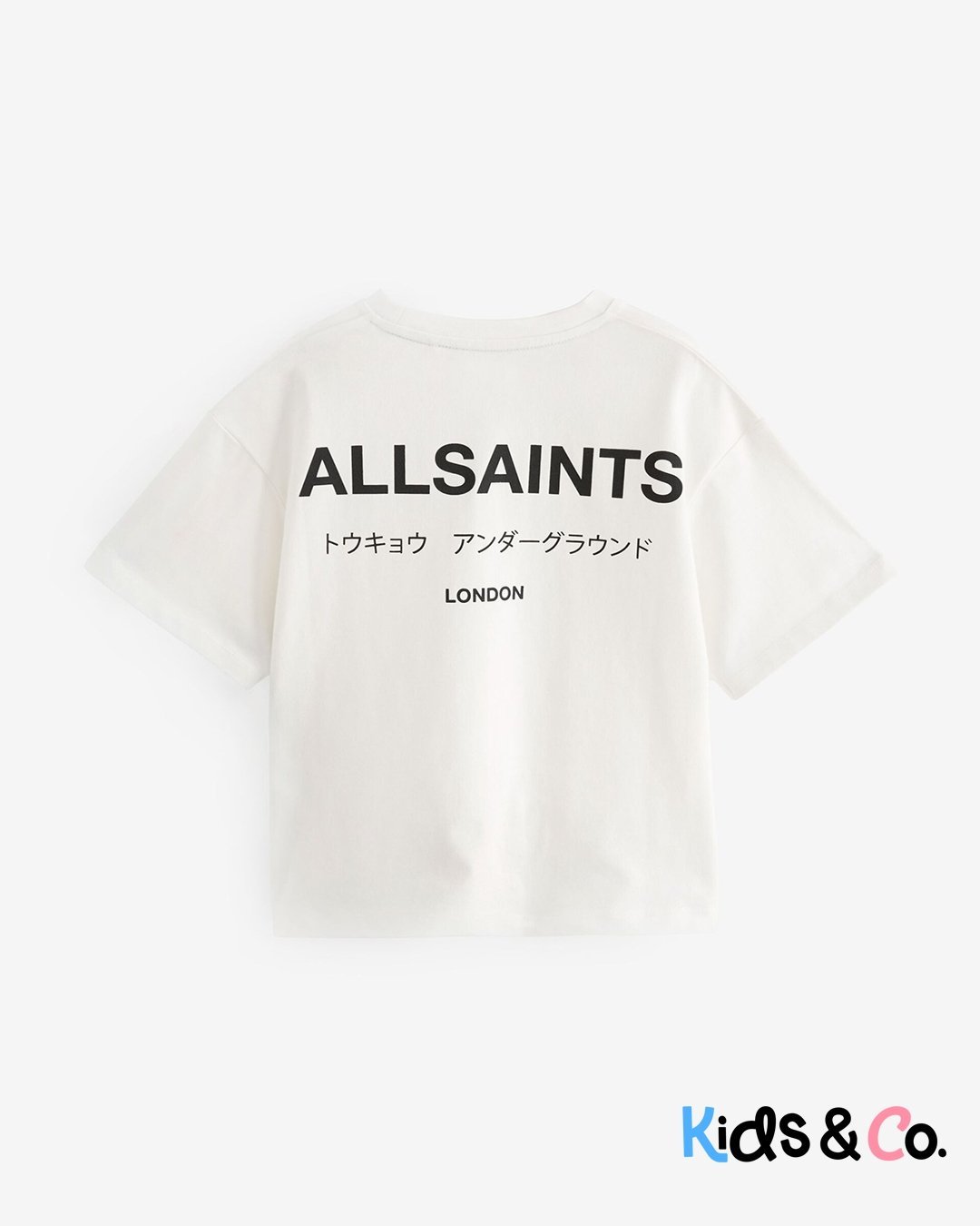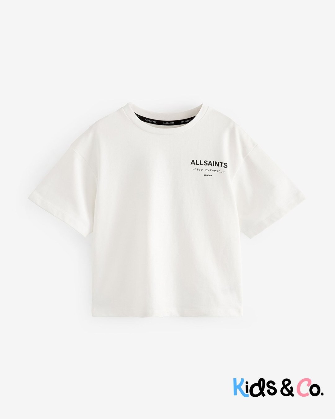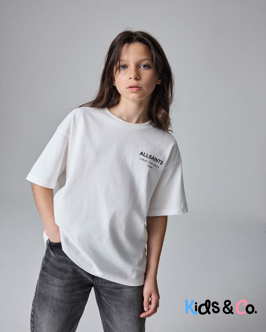 Crafted from cotton with an oversized fit, this white Underground T-Shirt from smALLSAINTS features the brand’s signature on the chest and back with a crew neck. It’s a timeless piece that will be their new favourite everyday style. AllSaints signature logo on the chest and back Crew neck Short sleeve Oversized fit Crafted from 100% cotton Machine washable. Main 100% Cotton. Neck 95% Cotton, 5% Elastane.