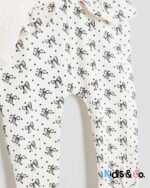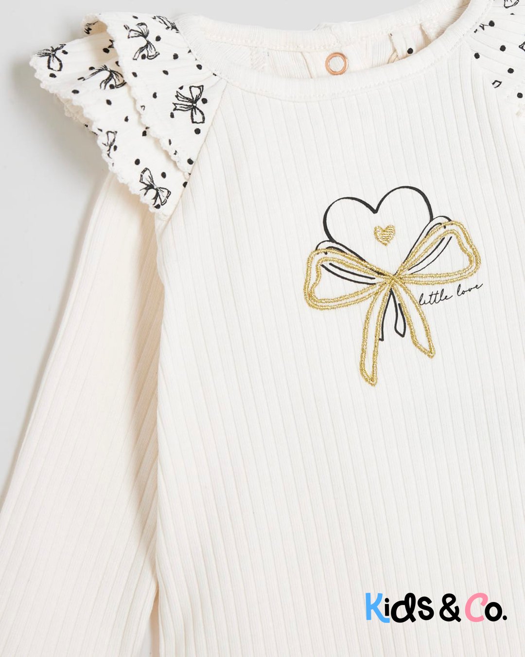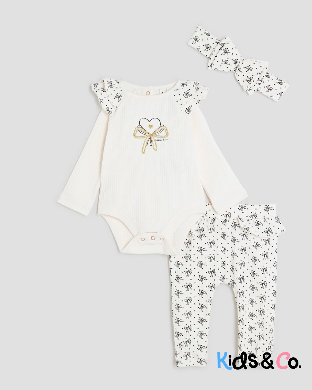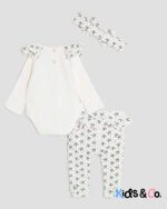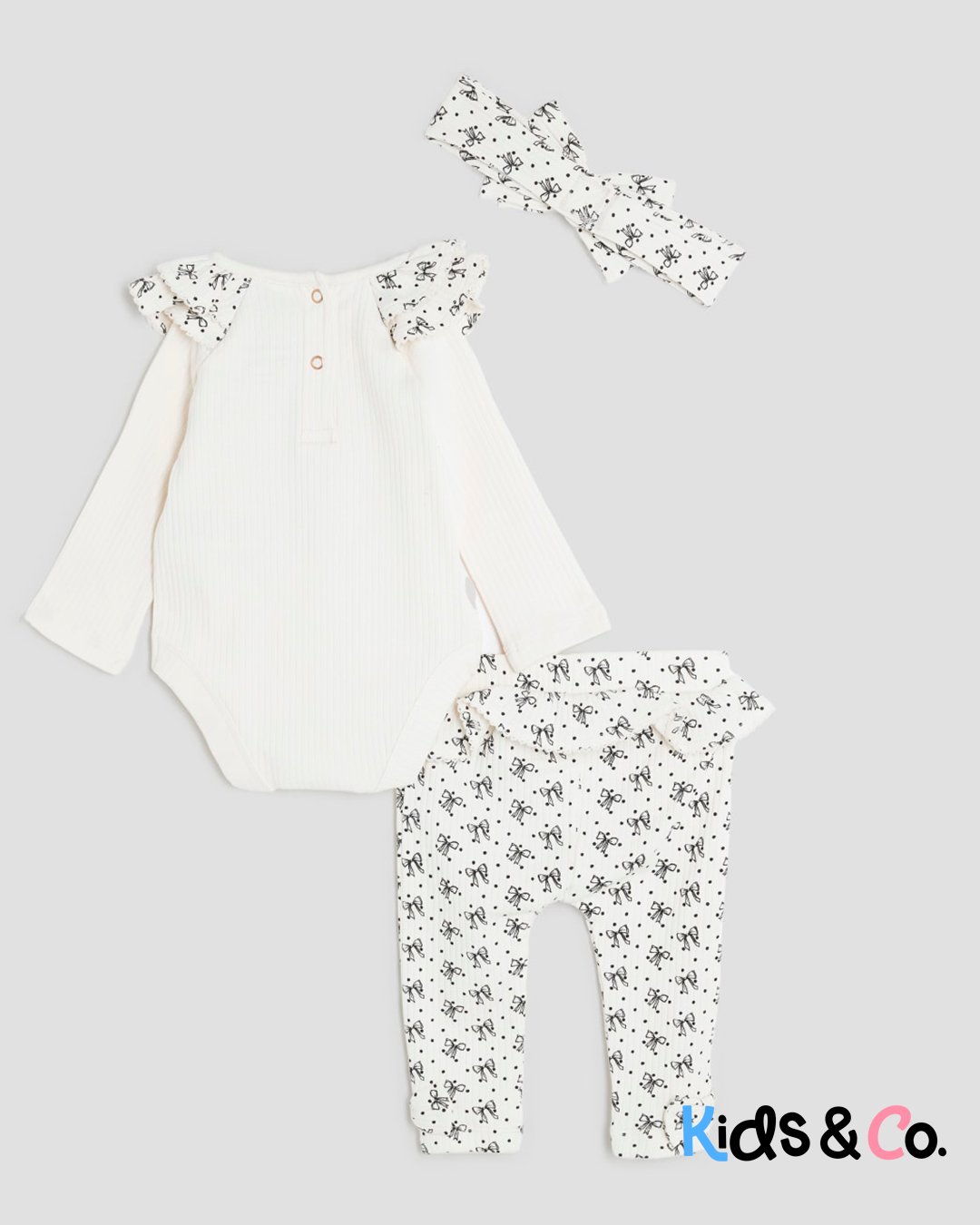 3 piece set Bodysuit, headband and leggings Ribbed fabric Bow print Round neckline Long sleeves Embroidered graphic Ruffle detail Popper fastening