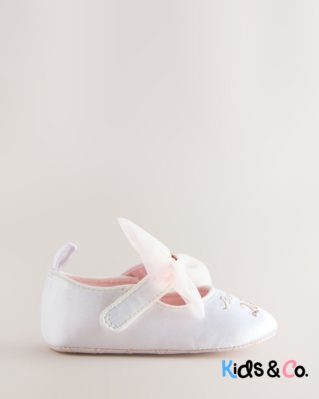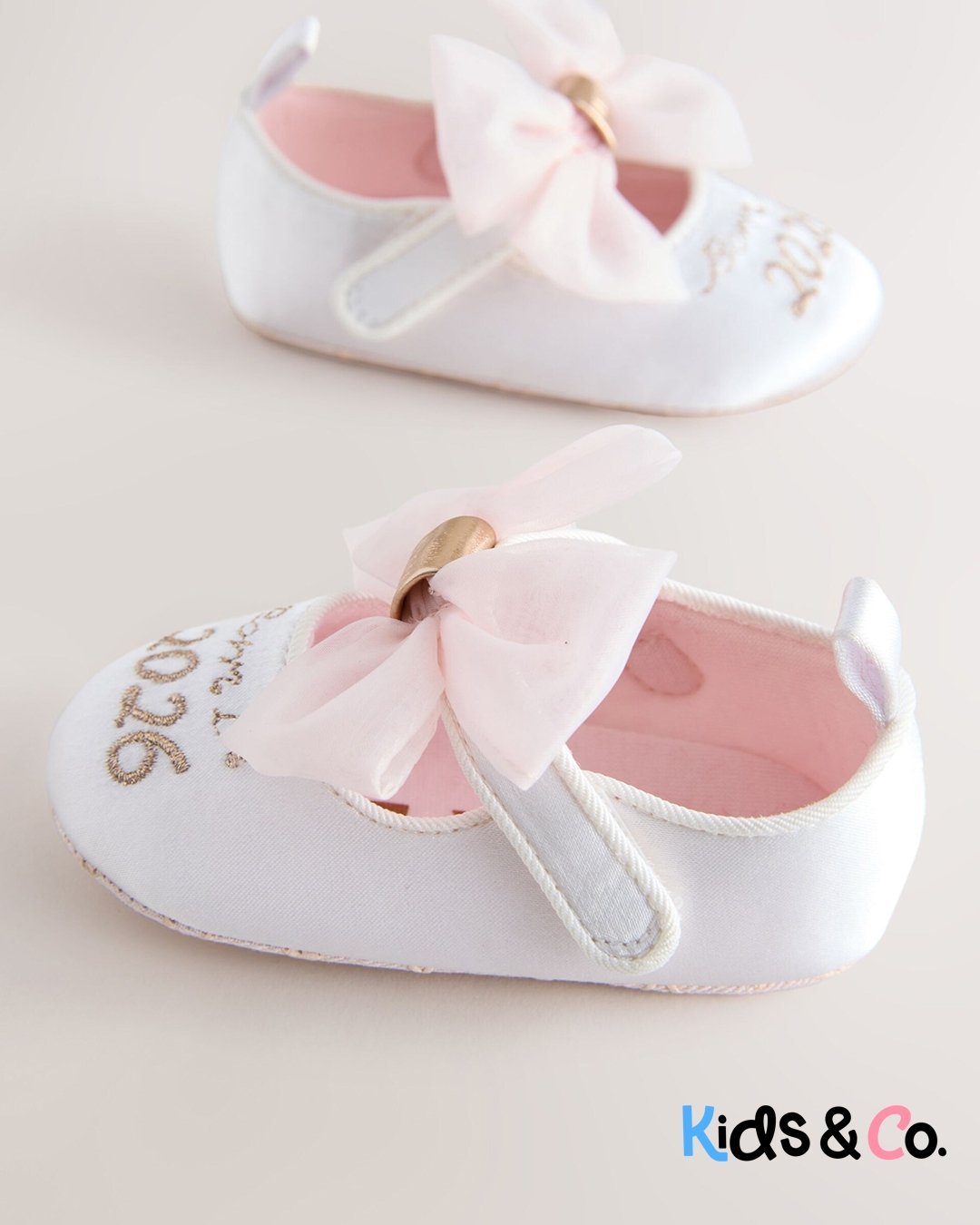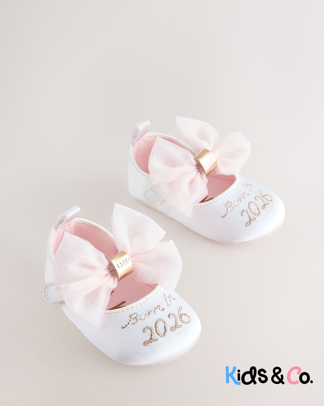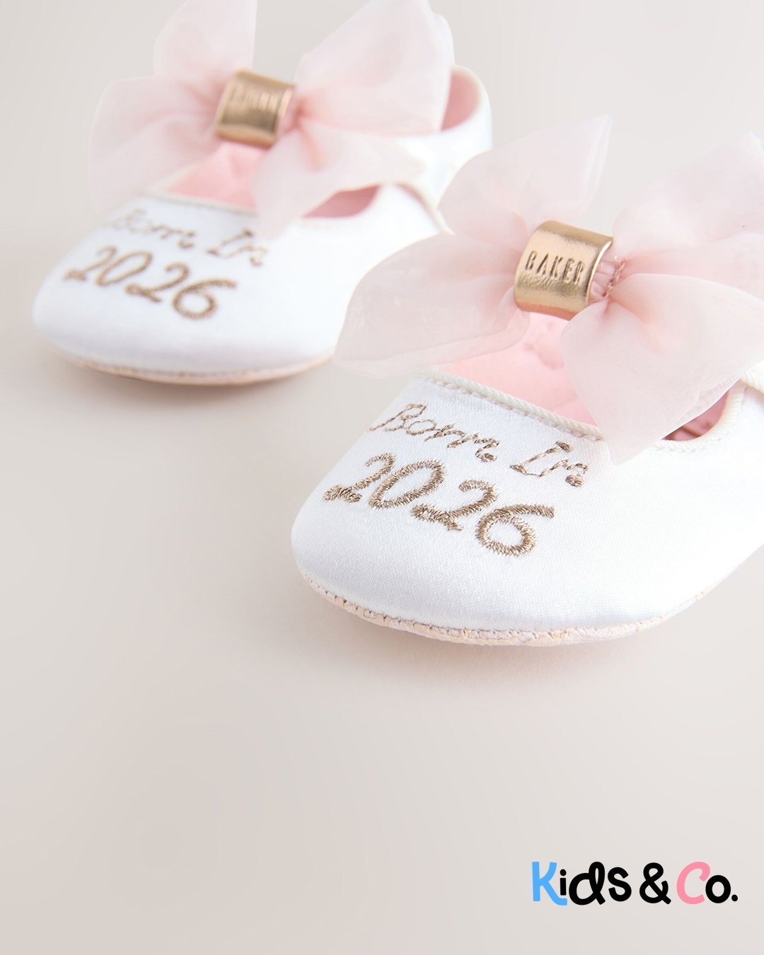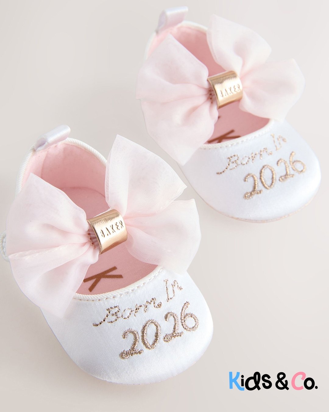 Celebrate a special arrival with the enchanting Baker by Ted Baker Baby Girls Born in 2026 Mary Jane Padders Shoes. These delightful Mary Jane padders feature a luxurious ivory satin upper, providing a soft and elegant touch for delicate feet. Adorned with a beautiful pink organza bow and charming ‘Born in 2026’ embroidery, they make a truly unique and memorable keepsake. Designed for ease and comfort, they boast a convenient touch and close fastening and a soft cushioned sole to keep tiny toes snug. Perfect for gifting to newborns arriving in 2026, these shoes are a treasured memento of their birth year. Ivory satin upper Pink organza bow Born in 2026 embroidery Touch and close fastening Soft cushioned sole Upper – 100% Polyester. Lining – 100% Polyester. Sole – 80% Polyester, 20% PU.