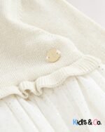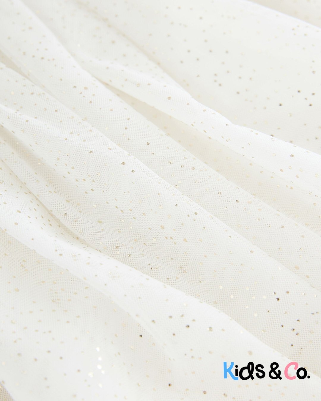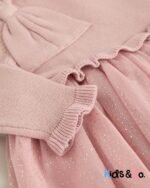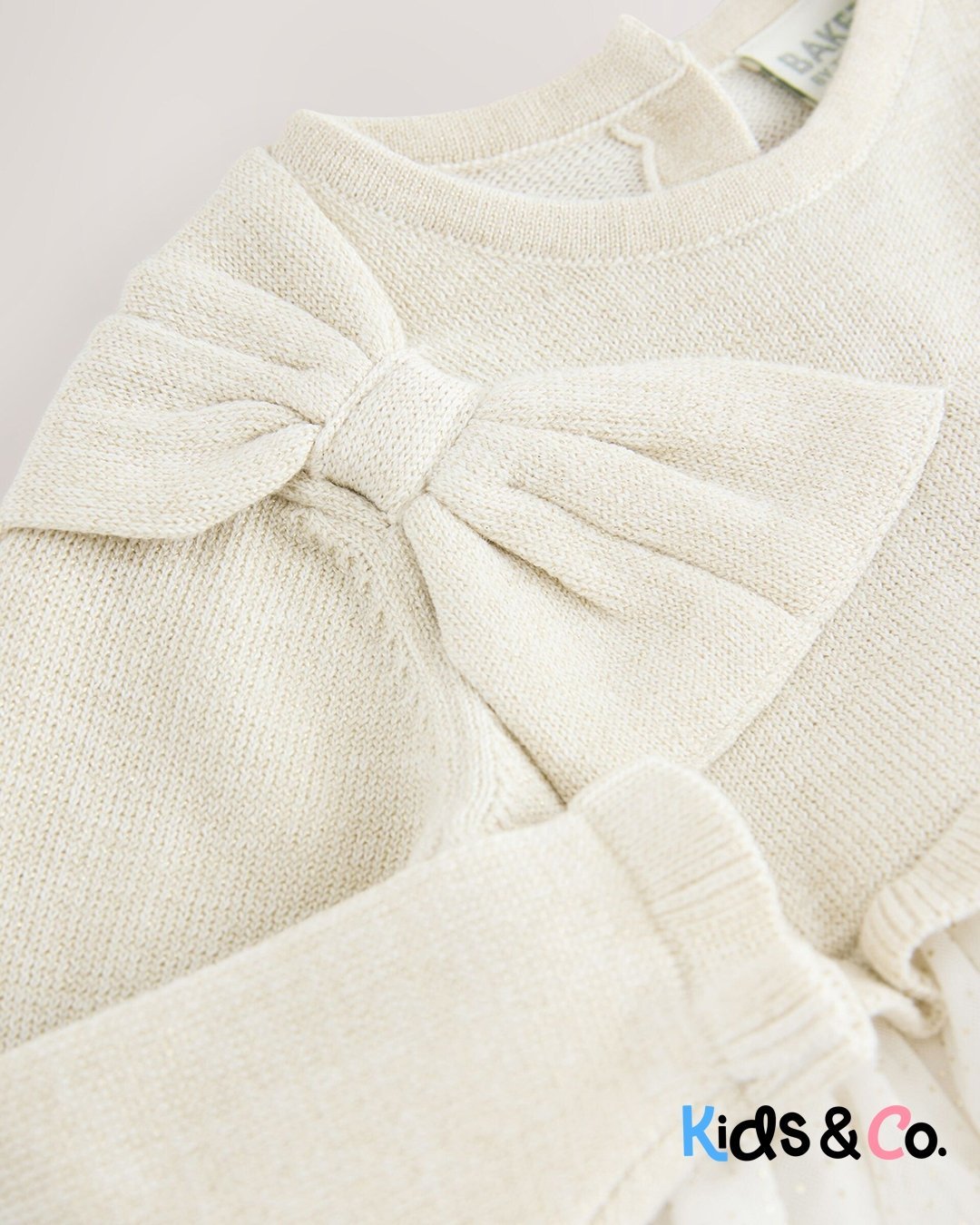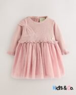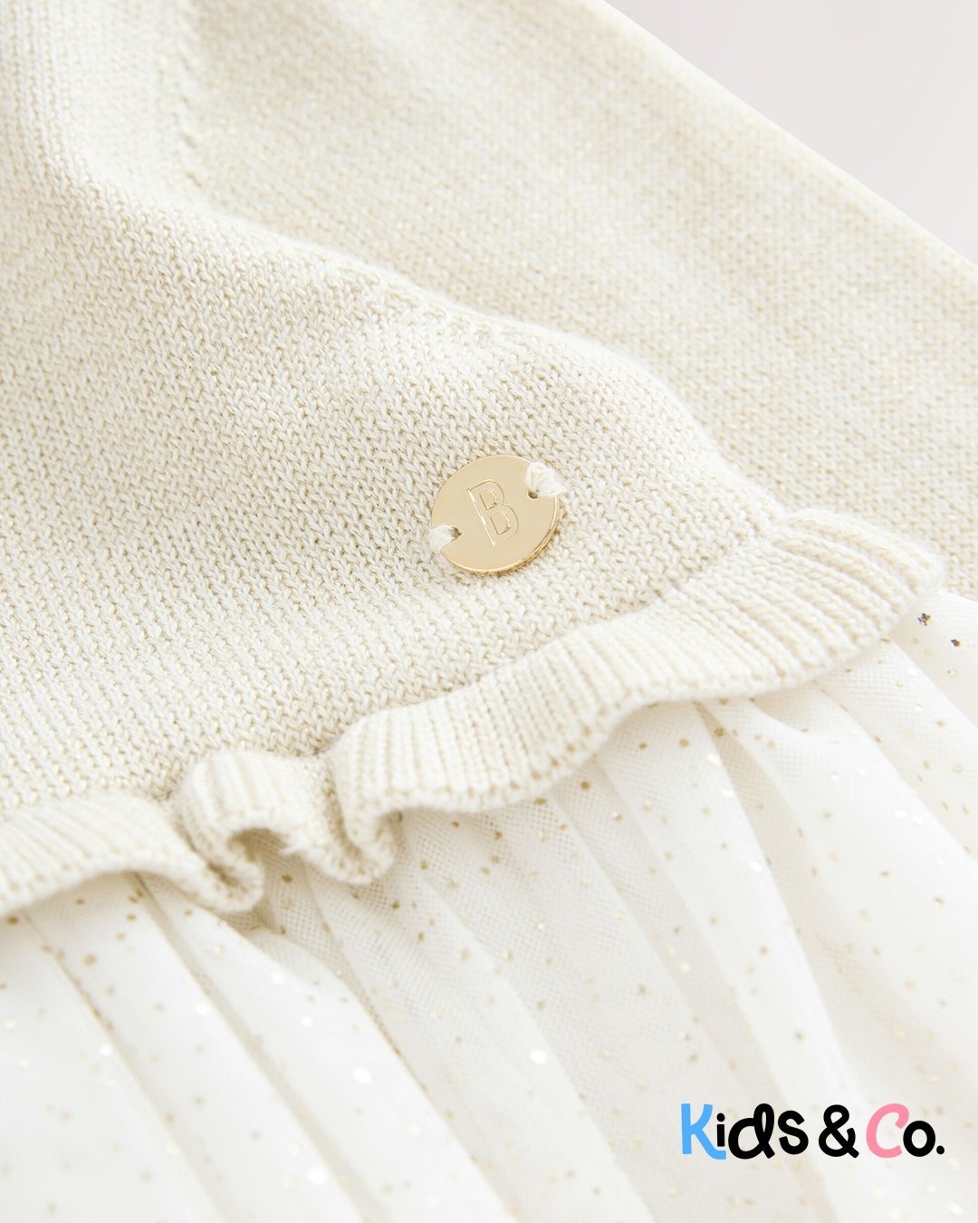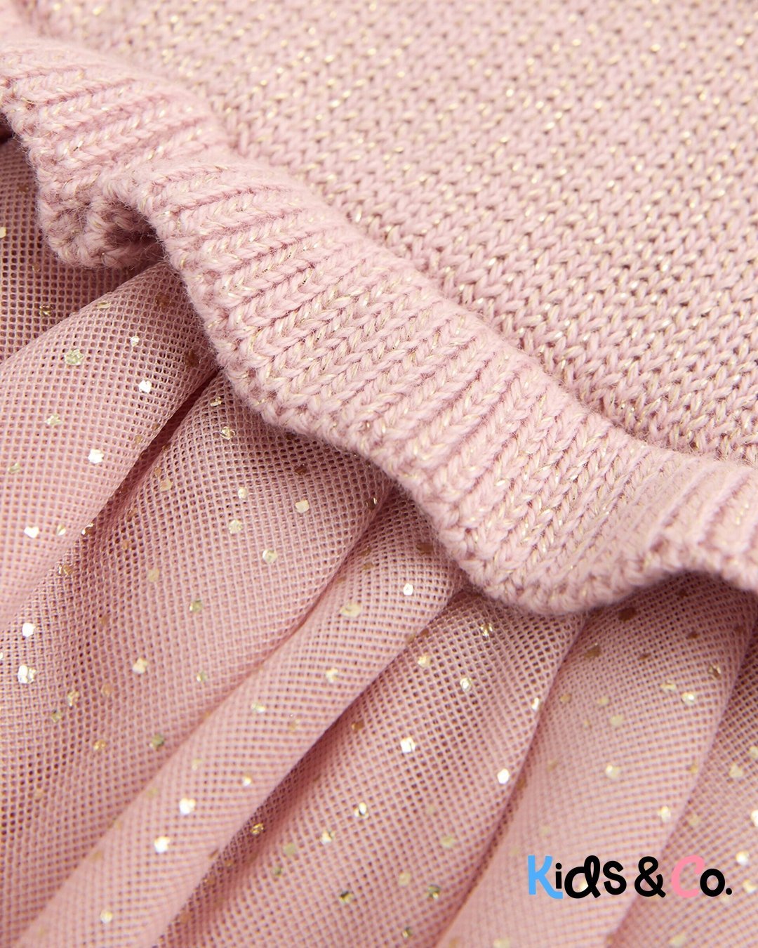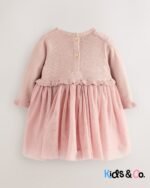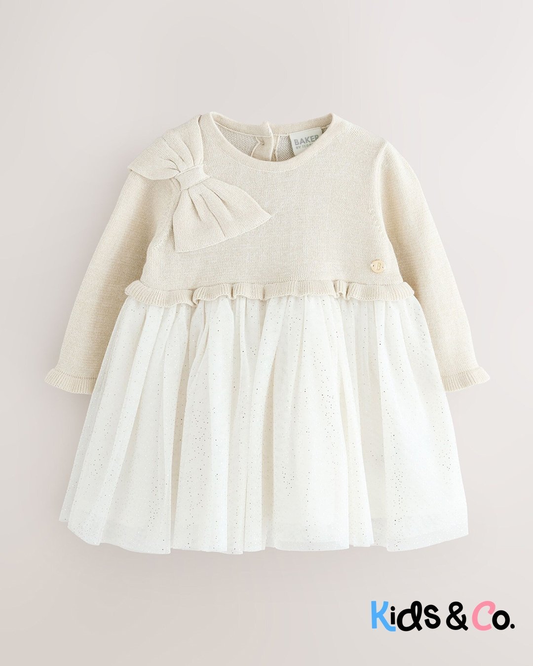 She’ll look pretty as a picture in this knitted glittery pink mockable dress from Baker by Ted Baker. This dress comes in a soft knit fabric mix with a beautiful soft mesh mockable skirt. The dress includes a mock bow feature on the shoulder, and a gold branded decal on the waist. The dress also has gold button closure at the back. Perfect for any time of the year, you can’t go wrong with this pretty piece! Main 90% Cotton, 7% Polyester, 3% Metallised fibre. Skirt 100% Polyester. Skirt Lining 100% Polyester. Main Lining 100% Cotton.
