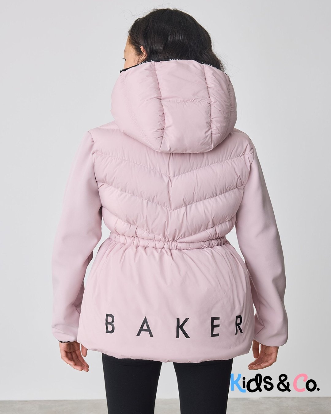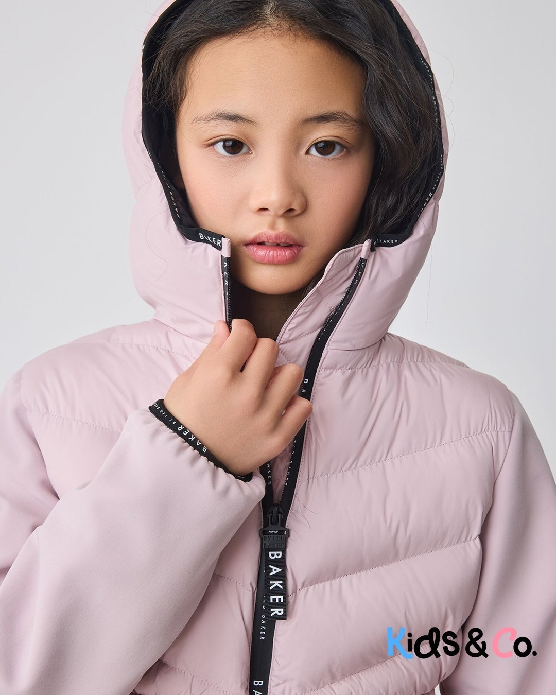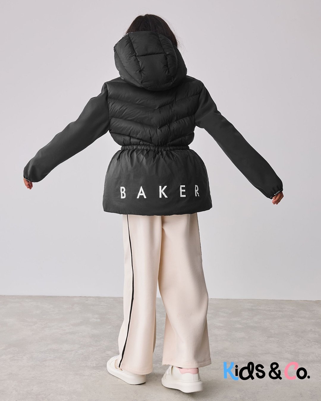 Ideal for chilly weather, she’ll feel warm and comfortable in this lightweight padded coat from Baker by Ted Baker. This coat comes in a chevron-style lightweight padded material, with a peplum hem and black contrast piping at the cuffs, hood and pockets. Features include the printed Baker logo at the back hem of the coat, with branded Baker zip pullers. Style with a pair of flares for the perfect cosy outfit.