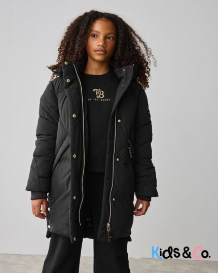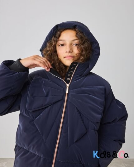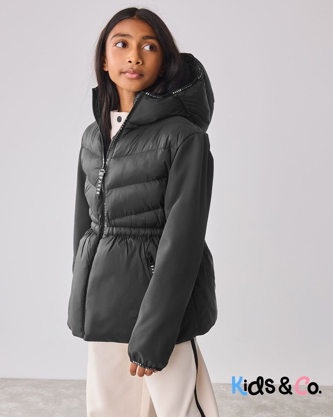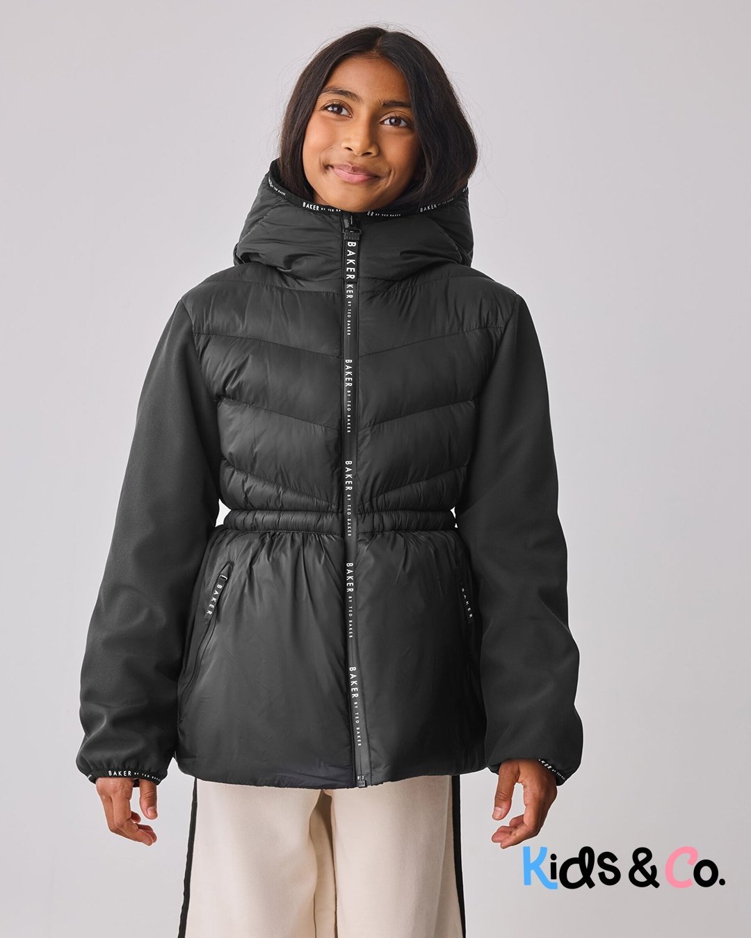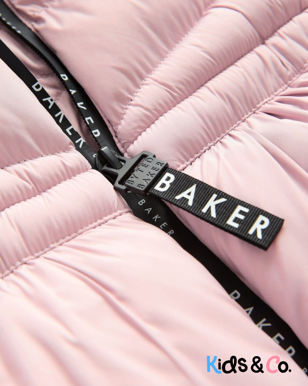 Ideal for chilly weather, she’ll feel warm and comfortable in this lightweight padded coat from Baker by Ted Baker. This coat comes in a chevron-style lightweight padded material, with a peplum hem and black contrast piping at the cuffs, hood and pockets. Features include the printed Baker logo at the back hem of the coat, with branded Baker zip pullers. Style with a pair of flares for the perfect cosy outfit.