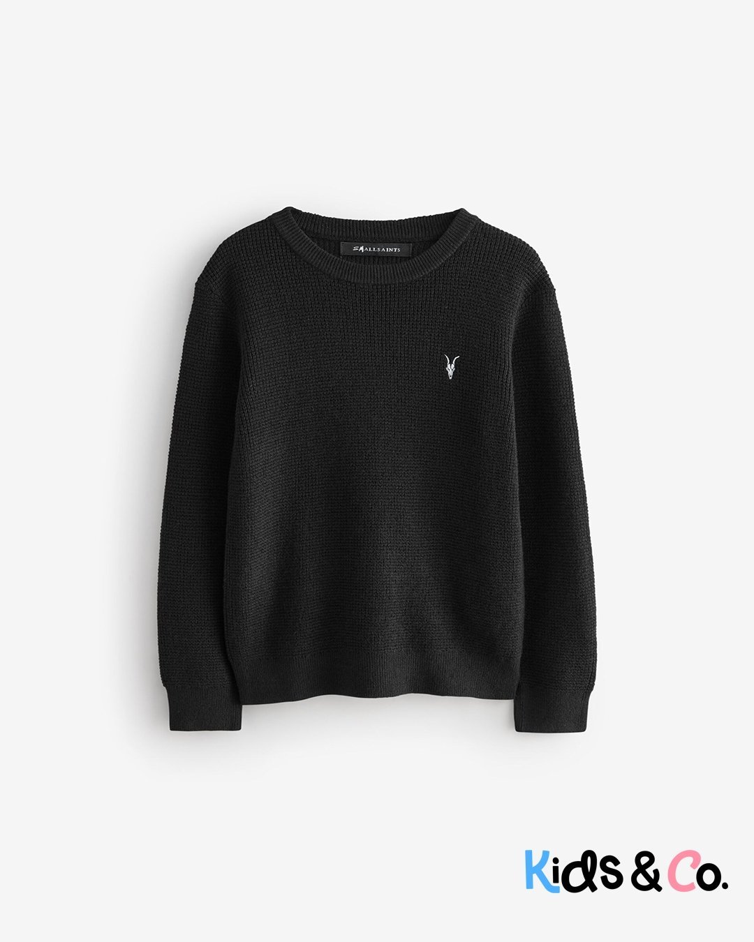 Equal parts soft and stylish, the black Waffle Knitted jumper from smALLSAINTS is a new season staple. Refresh their rotation with this knit that contains wool and has a crew neck with a waffle texture and the iconic AllSaints Ramskull embroidery on the chest. Layer it up with a t-shirt, jeans and boots for the perfect winter outfit. Waffle knitted black jumper AllSaints Ramskull embroidery on the chest Crew neck Long sleeve Contains 30% Wool Machine washable. 40% Acrylic, 30% Wool, 30% Nylon.